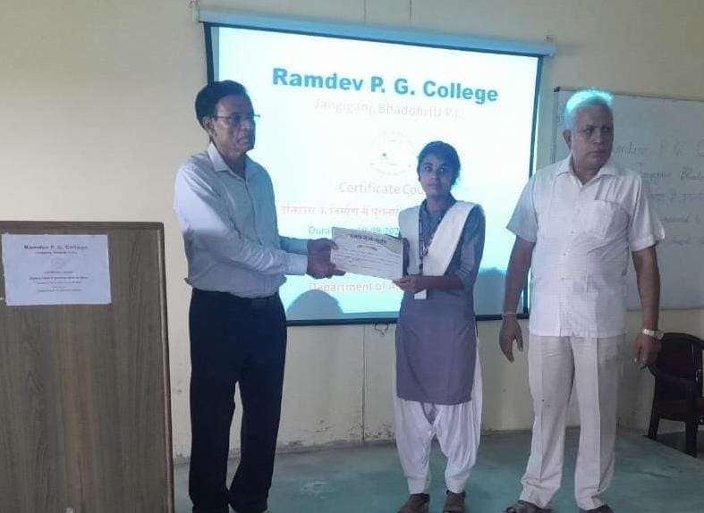 भदोही। रामदेव पी.जी.कालेज जंगीगंज भदोही में सात दिवसीय “इतिहास के निर्माण में पुरातात्विक साक्ष्यों की भूमिका’ विषयक प्रमाण पत्र कार्यक्रम का समापन हुआ। इस कार्यक्रम में बी०सी०ए० द्वितीय वर्ष के 76 विद्यार्थियों ने प्रतिभाग किया। अंतिम दिवस मुख्य वक्ता ने प्रमुख पुरास्थलों हणप्पा, कालीबंगा, तक्षशिला, अरिकामेडु आदि के बारे में जानकारी प्रदान की। व्याख्यान के उपरांत विद्यार्थियों का बहुविकल्पीय प्रश्नों द्वारा मूल्यांकन किया गया तथा अन्त में प्रतिभागियों को चेयरमैन राजबली मिश्र व प्राचार्य पंकज कुमार शुक्ल द्वारा प्रमाण पत्र वितरित किया गया। इस अवसर पर चेयरमैन राजबली मिश्र ने प्रतिभागियों के उज्ज्वल भविष्य हेतु शुभकामनाएं प्रदान किया। इस अवसर पर महाविद्यालय के प्राध्यापकगण असि. प्रोफेसर पंकज पाण्डेय, असि. प्रोफेसर ओम क्रांति यादव व अन्य उपस्थित रहे। आभार ज्ञापन आई. क्यू.ए.सी. समन्वयक असि. प्रो. त्रिनेत्र राम तिवारी ने किया।