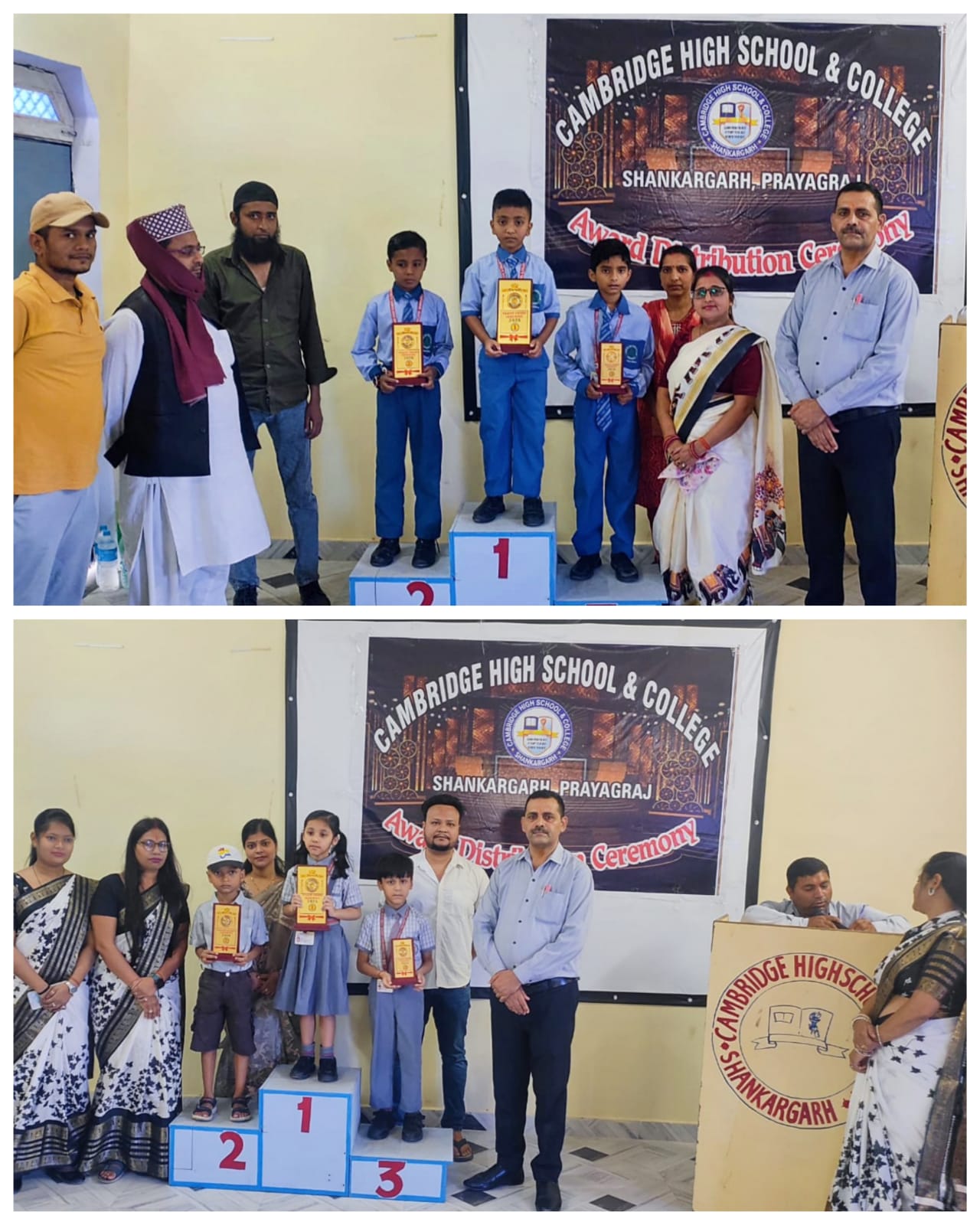 प्रयागराज। जनपद के यमुनानगर नगर पंचायत शंकरगढ़ स्थित कैम्ब्रिज हाईस्कूल एण्ड काॅलेज में हुए वार्षिक परीक्षा परिणाम दिवस पर कक्षाओं में टॉपर रहे बच्चों को पुरस्कार देकर सम्मानित किया गया। विद्यालय के प्रशासनिक अधिकारी बालेन्द्र पांडेय ने बताया कि विद्यालय में कक्षा नर्सरी से कक्षा आठ,नौ और 11वीं तक के विद्यार्थियों के लिए वार्षिक परीक्षा परिणाम दिवस मनाया गया। इसमें कक्षाओं में प्रथम तीन स्थानों पर आने वाले छात्र एवं छात्राओं को सम्मानित कर उनका उत्साहवर्धन किया गया। इस अवसर पर विद्यार्थियों के अभिभावक एवं माता-पिता भी मौजूद रहे। इसके साथ ही विद्यालय में शैक्षणिक वर्ष में कक्षाओं में कराई गई विभिन्न गतिविधियों के विषय में अभिभावकों को विस्तारपूर्वक बताया गया। विशेष अंक प्राप्त करने वाले विद्यार्थियों में कक्षा नर्सरी से अदिति मिश्रा,आराध्या त्रिपाठी,आकृति पाण्डेय, एल के जी से कृति, अपूर्वा पाठक,कृतिका सिंह, यू के जी से देवांश वर्मा, रेहान खान,प्रनीत कुमार, एक से इशान्या वैश्य,नवनीत प्रताप सिंह, अविरुद्ध वैश्य, दो से अरहम कादरी, बिलावल हसन,लक्की कुमार, तीन से अवनी सिंह, आरव केसरवानी चार से धैर्य सिंह,हयान गुप्ता, अभिषेक द्विवेदी,पांच से इकरा सिद्दीकी,रूही तिवारी, रितिक सिंह, छः से ओजस सिंह, आस्था त्रिपाठी,रूकसार शेख, सात से आस्था मिश्रा,तृषा गुप्ता,साहिल सिंह, आठ से सौम्या केसरवानी, अवनी केसरवानी, अमन राठौर नौ से उत्कर्ष त्रिपाठी,आयुष मिश्रा,वीर गुप्ता,ग्यारह से शशि वर्मा,वंश केसरवानी, अवन्तिका मोदनवाल क्रमशः प्रथम,द्वितीय और तृतीय स्थान पर रहे। प्रबंधक संतोष त्रिपाठी ने बच्चों की सफलता की भूर-भूर प्रशंसा की और उनके उज्ज्वल भविष्य की कामना की। अंत में शिक्षक इमरान अहमद ने आए हुए अभिभावकों के प्रति आभार प्रकट किया।इस अवसर पर विद्यालय के प्रशासनिक अधिकारी बालेंद्र पांडेय, मनी शंकर दुबे,सौरभ प्रकाश,इमरान अहमद, धर्मराज कुशवाहा,पंकज मिश्रा,मनोज तिवारी,पंकज श्रीवास्तव, राजेश गोस्वामी ,अखिलेश पांडे,दीपक केशरवानी, बृजेश मिश्रा, रीतु सुसारी,रेखा सिंह, रीना गोस्वामी, सिम्मी गुप्ता, ऊषा सिंह, प्रीति सेन, निहारिका सेन, अंजु गुप्ता , सीमा सिंह, पूनम द्विवेदी, कोमल त्रिपाठी, आदि शिक्षक- शिक्षिकाएं उपस्थित रहे।